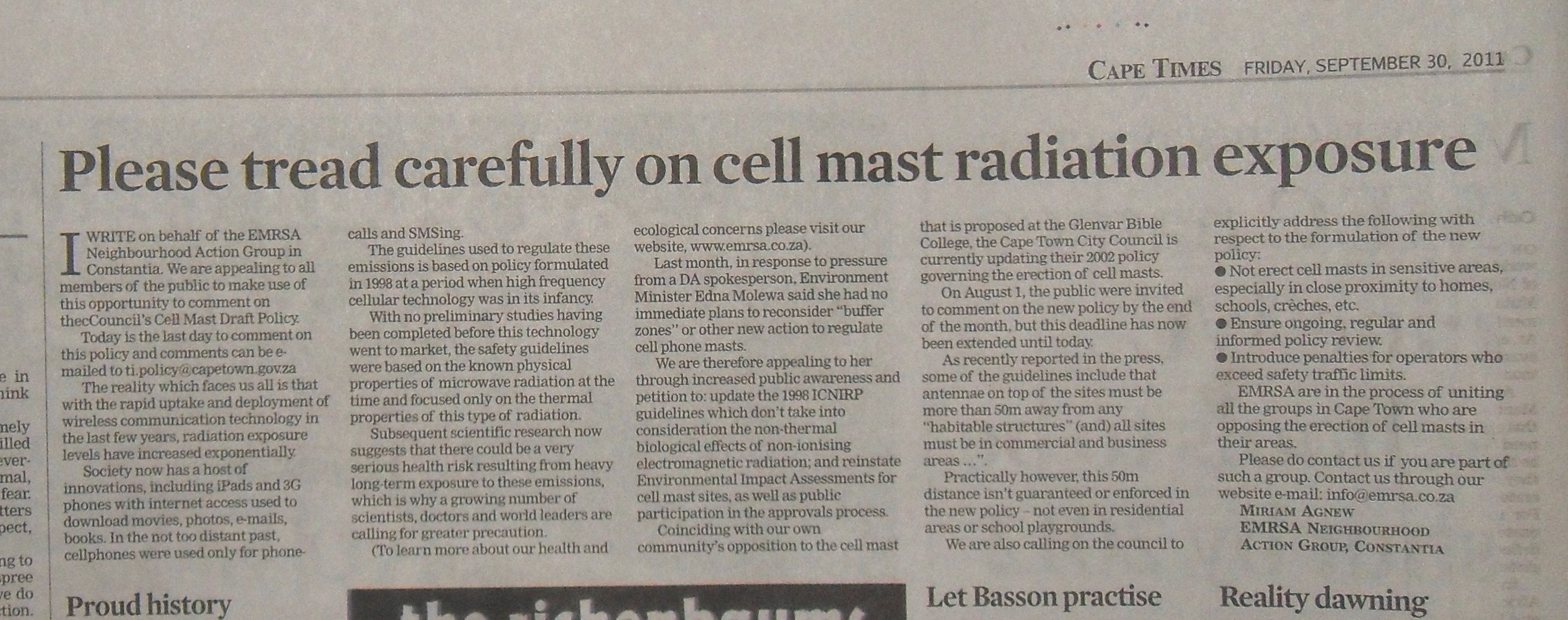Last month, in response to pressure from DA spokesperson, Environment Minister Edna Molewa said she had no immediate plans to reconsider “buffer zones” or other new action to regulate cellphone masts.