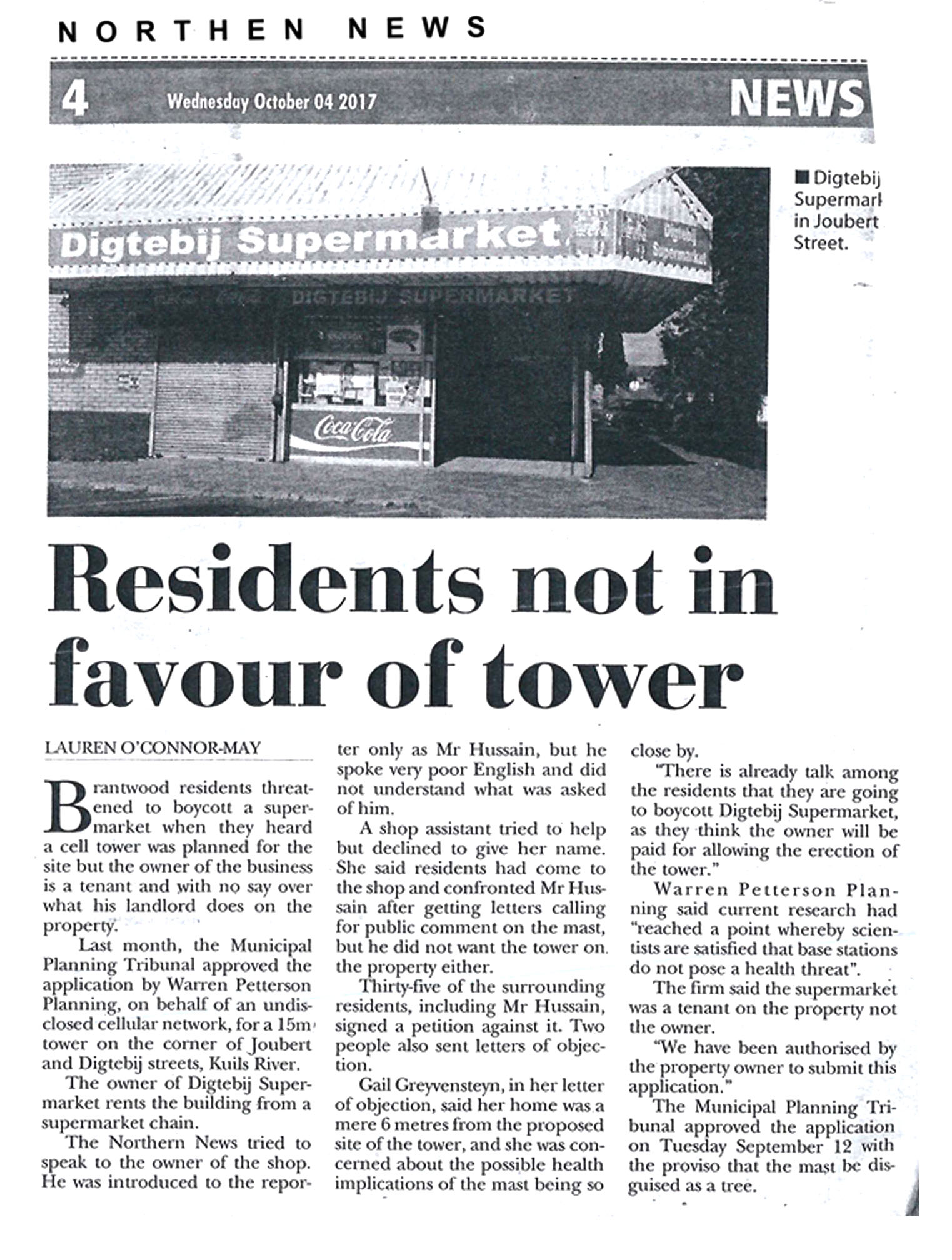 Brantwood residents threatened to boycott a supermarket when they heard a cell tower was planned for the site but the owner of the business (Mr Hussain) is a tenant with no say over what his landlord does on the property.